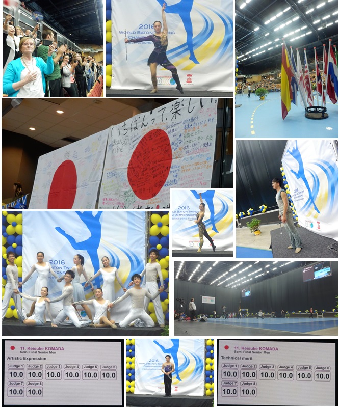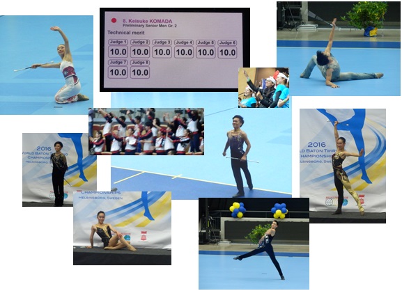 大会3日目、いよいよチームの予選が始まった。 各国の熱い闘志を感じる演技が行われ、とくに日本代表は呼吸のあった演技で、バトンをキャッチするたびに会場がどよめいた。他を寄せ付けない演技で、1位で予選を通過した。 そして、昨日の予選に引続き個人の準決勝が行われた。 日本選手団は昨日の予選よりもさらに磨きをかけ、洗練された演技で観客を魅了した。その中でも駒田選手はノードロップで、誰もが納得の10.0満点で準決勝を終えた。 長かったスウェーデン・ヘルシンボリでの大会も明日がいよいよ最終日、日本代表団は必ず何かをのこしてくれるでしょう。日本時間の23時30分(予定)にすべてがきまる。 | |||